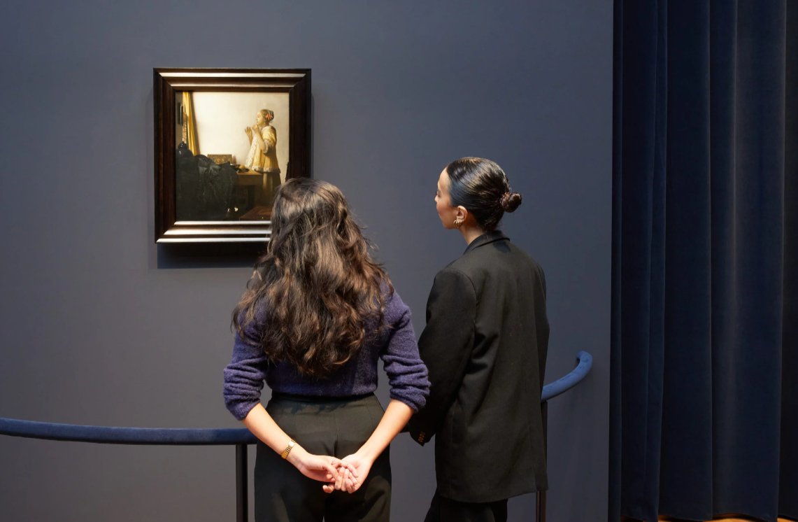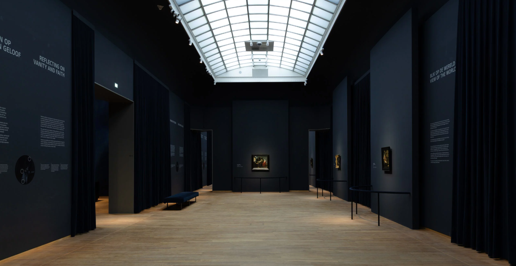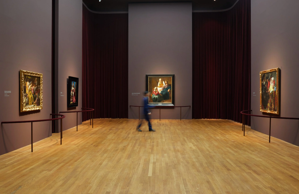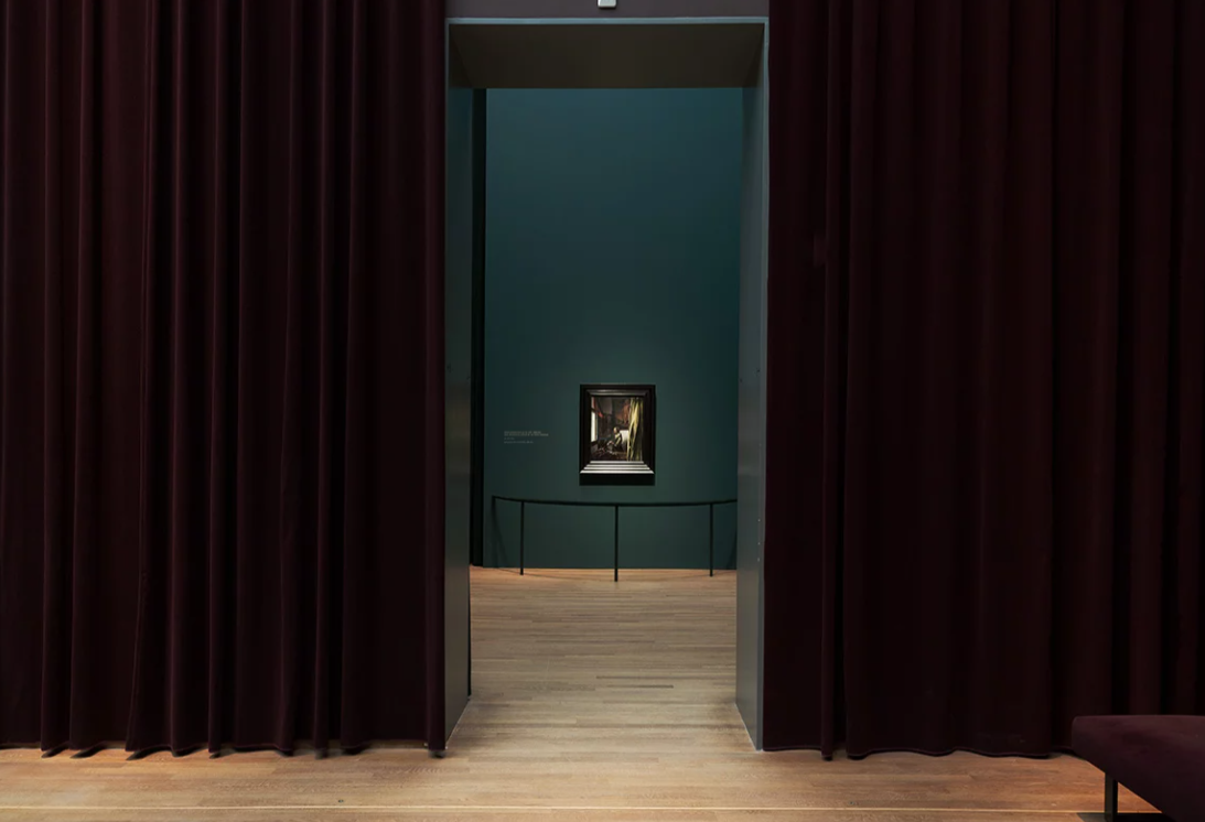When Jean-Michel Wilmotte visited the Rijksmuseum for the first time some twenty years ago, he was amazed by the collection and this monumental building, but he was also struck by the omnipresent scenography, which consisted of covering almost all the walls with endless drapes and pleats, throughout the visit to the museum’s rooms. The exhibition’s scenography is based on this evocation of the Rijksmuseum and its origins, but also and above all on Vermeer’s characteristic framing, compositions and staging. Right from the entrance, a space suggests light, a veritable subject in Vermeer’s work. The velvet and its subtle reflections form a warm, protective setting around the works. They create a perfect osmosis with the light, colours and muted atmosphere of Vermeer.